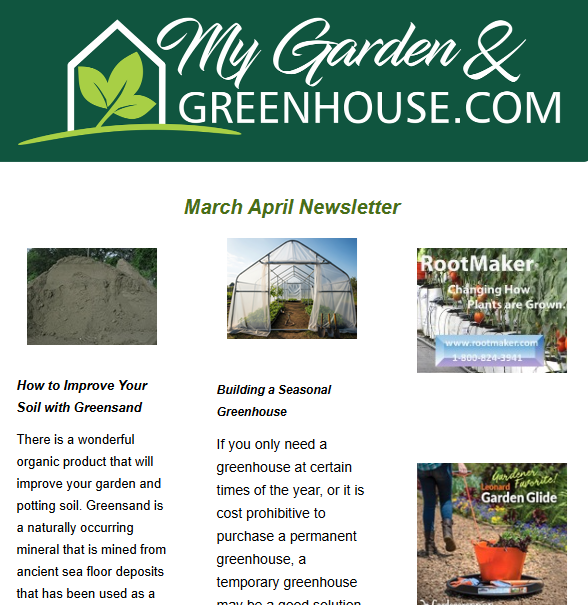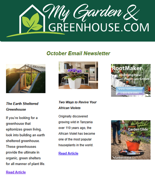 The MyGardenAndGreenhouse.com Monthly Email Newsletter contains articles and product information that will help you grow better in a greenhouse and outside of one too!